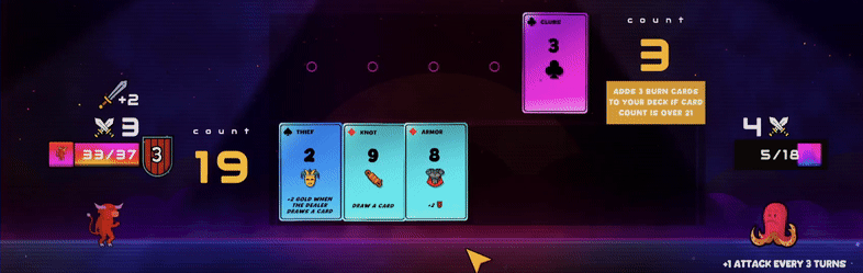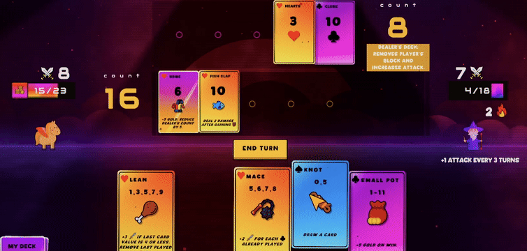 A roguelike deckbuilder that twists blackjack into a tactical battle.